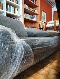 Divano due posti marca Seven in tessuto grigio melange con braccioli arrotondati, schienali e sedute imbottite separabili; look neutro adatto a living moderni o ufficio, già protetto con pellicola per lo stoccaggio . Le dimensioni 180 cm lo rendono compatto ma comodo per due persone.