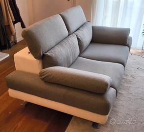 Divano Poltronesofà 2 posti maxi con ampie sedute, poggiatesta e braccioli reclinabili, cuscini lombari in piuma d'oca, struttura in ecopelle bianca e cuscini in tessuto grigio melange, in ottime condizioni, senza strappi o macchie, completamente sfoderabile e lavabile, piedi in metallo.
