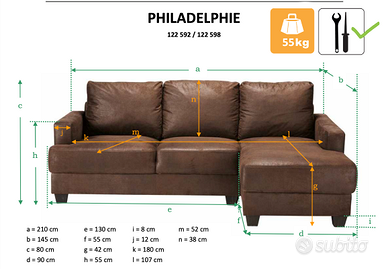La struttura è composta dalla base delle tre sedute più la chaise longue ad incastro. Il rivestimento è in pelle scamosciata, non sfoderabile ma si pulisce facilmente con un panno umido o un pulitore a vapore.
