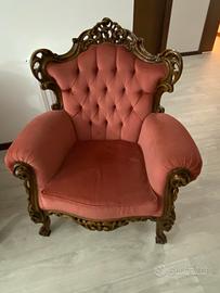 Vendo divano 3 posti + 2 poltrone in stile Barocco.+ 2 poltroncine. Rivestimento in velluto colore rosa antico ed elementi in noce intarsiato. Elementi di lusso adatti all'arredo sia di case che di sale d'aspetto o entrate di Hotel e/o ristoranti, donano un'atmosfera di magnificienza e raffinatezza.