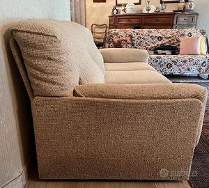 Divano a 3 e direi anche 4 posti e due poltrone ricoperti in tessuto chiaro, che ora compare in pubblicita’ da Minotti, Natuzzi, Doimo - perche’ e’ tornato lo stile retro ‘70/’80