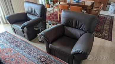 Vendo salotto completo in pelle colore marrone scuro, composto da divano a 3 posti e due poltrone abbinate.