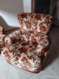 Divano 3 posti + 2 poltrone in tessuto e legno massello, condizioni discrete. Ha qualche difetto dovuto all'usura del tempo.