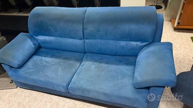 Vendo per cambio abitazione questo divano 3 posti colore blu. Ha 10 anni ma è molto solido e la seduta è ancora molto sostenuta. Ci sono dei lievi scolorimenti nella parte alta dello schienale. Prezzo 280 euro.