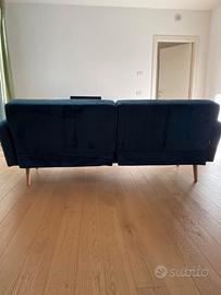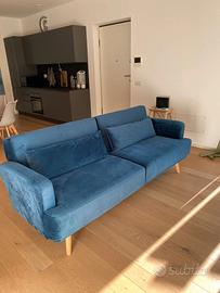 Vendo divano 3 posti. La struttura è in tessuto blu velour, le gambe in legno chiaro completano il look.