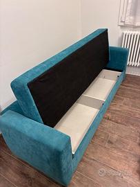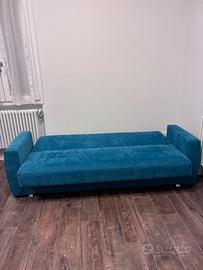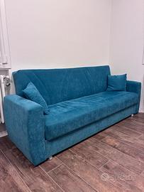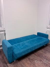 Vendo divano 3 posti color ottanio. Usato poco, circa 2 anni. Tessuto in ottimo stato e privo di macchie. Schienale ribaltabile trasformandolo facilmente in un divano-letto. Trasporto a vostro carico.