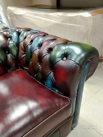 Divano 3 posti ( e poltrone ) modello club harlequin patchwork inglese originale realizzato artigianalmente in Inghilterra secondo la tradizione chester inglese, con pelle bovina di pieno fiore tamponata e stonalizzata a mano. Nella fodera sottostante il cuscino è cucito il certificato di autenticità.