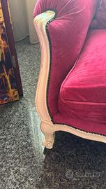 Vendo divano 3 posti + 2 poltrone interamente ritapezzato in velluto fucsia in ottime condizioni. 5 cuscini e tavolino con marmo inclusi. Prezzo trattabile. Da ritirare autonomamente