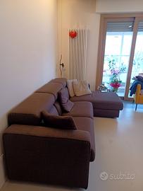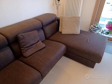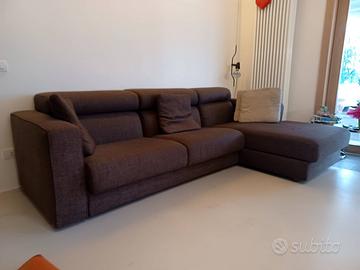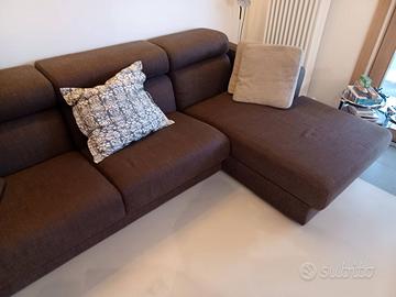Divano 3 posti con chaise longue lato dx, rivestito in stoffa di colore con sedute sfoderabili; sedute con meccanismo di scorrimento poggiatesta reclinabili. Struttura e cuscini in ottime condizioni. Lunghezza 2,70 m circa. Vendesi per cambio completo arredo, trasporto a carico dell'acquirente.