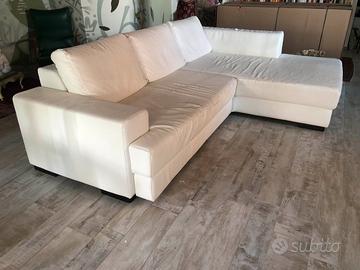 Divano 3 posti con chaise-longue e vano contenitore. Lunghezza ml 2,65 - larghezza ml 1,1 parte con contenitore - larghezza ml 1,95 parte chaise-longue. Struttura perfetta e solidissima. Rivestimento in similpelle bianca da rifare.