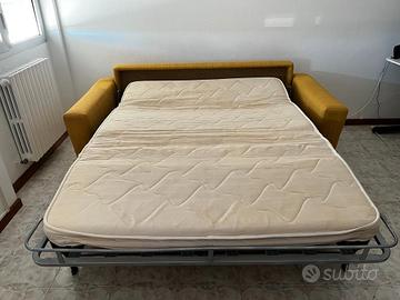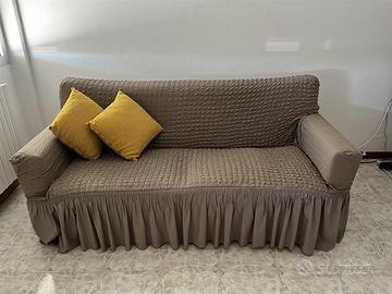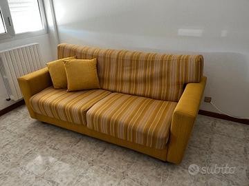 Metto in vendita un divano a tre posti in buone condizioni, perfetto per il soggiorno o la sala TV. Il rivestimento in tessuto a righe gialle e bianche dona un tocco vivace e accogliente all’ambiente. Include due cuscini coordinati, un copridivano e un letto estraibile ideale per ospiti.