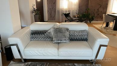 Divano 3 posti in pelle bianca Dondi Salotti, usato pochissimo e in buone condizioni. La pelle è ben conservata, con un picoolo segno di usura sul bracciolo destro. Linea semplice e pulita, adatto a diversi tipi di arredamento.