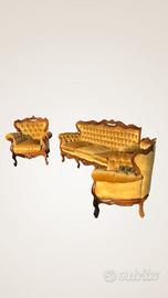 Salotto composto da 1 Divano 3 posti in struttura di legno, in velluto senape, stile vintage anni 60/70 ottime condizioni, e 2 poltrone, si può avere anche tavolinetto in legno.