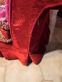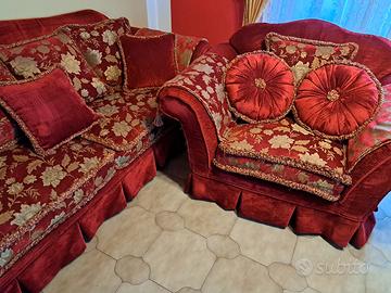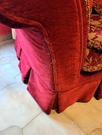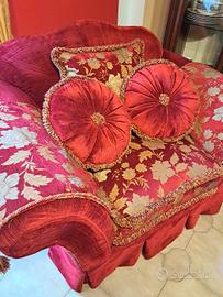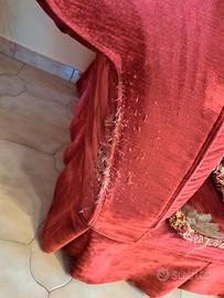Divano 3 posti e poltrona Rosso con finiture dorate Marca Koema In buone condizioni, ma rovinato in alcuni punti per i graffi del gatto