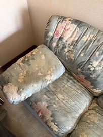 Il divano è strutturalmente solido e comodo, ma presenta segni di utilizzo e tessuto vissuto, come visibile in foto.