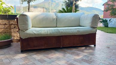 divano in vimini completo di cuscini e copri cuscini sfoderabili. Può essere usato come letto singolo di fortuna in quanto al posto del cuscino ha un materasso su misura...vano contenitore.. leggermente usurato.