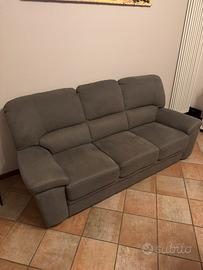 Vendo comodo divano a 3 posti con rivestimento in tessuto color grigio antracite/fumo. Il divano presenta una seduta accogliente con schienale alto e poggiatesta imbottiti, ideale per il massimo relax.