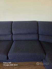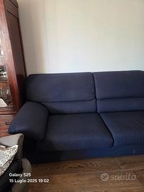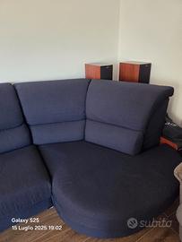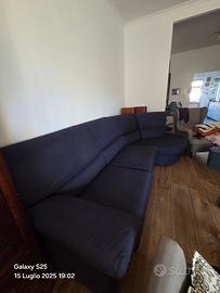 Bellissimo divano angolare di colore blu, in tessuto. È composto da tre posti più un elemento angolare. - Si presenta in buone condizioni, pronto per essere utilizzato. - Azienda italiana, struttura in legno massello, schienale alto. Completamente sfoderabile. Lunghezza completa compreso angolo 3mt, profondità 98cm, profondità dell'angolare 1,5 mt