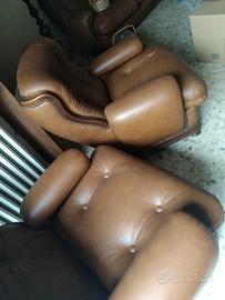 Vendesi divano 3 posti più due poltrone. Articoli in vera pelle con struttura legno pieno, anni 80. Ben conservati. Il divano ed una poltrona mancano di alcuni bottoni. Da ritirare in loco.