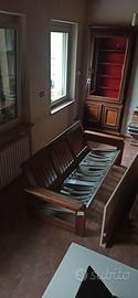Set di mobili da soggiorno in legno massello con un divano a tre posti e una poltrona abbinata. Cuscini rifoderati recentemente