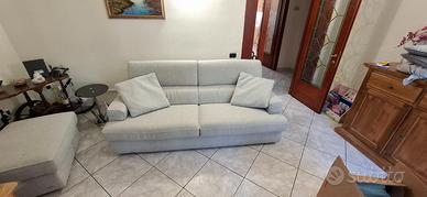 Vendo divano 3 posti con pouf usato pochissimo, con una leggera macchia di cioccolato nell'angolo,poggiatesta regolabili,buono stato. Ritiro a mano. Misure divano Larghezza 210cm Profondità 110cm Altezza 90 cm Pouf Larghezza 87 cm Profondità 62 cm