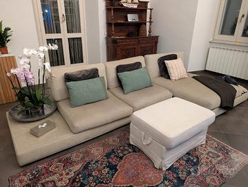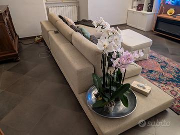 Divano 3 posti + chaise longue marca Musa Divani . Il divano è composto da 2 pezzi separati una seduta 3 posti con appoggio laterale da 220 cm x 100 prof. + 1 chaise longue 130 x 160 profondità .