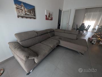 Divano 4 posti angolare con poggiatesta regolabili, dimensioni 200 cm larghezza e 170 cm lunghezza L. Interamente sfoderabile. Ottimo stato nessun difetto, colore tortora.