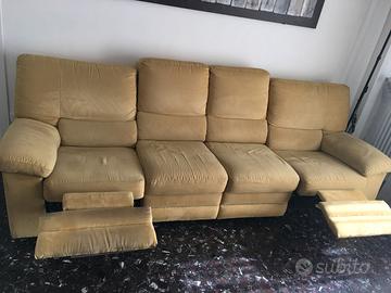 Divano "Dondi Salotti", color giallo, rivestimento in tessuto simil alcantara (sempre stato coperto da copridivano), lunghezza 2,70 metri, profondità 1 metro, alza piedi meccanico.