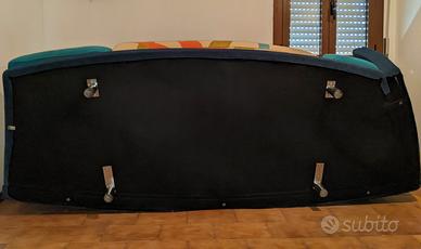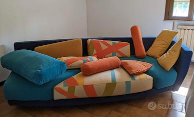 Divano in tessuto , struttura in metallo. Inizio anno 2000. Larghezza cm 275, profondità cm 100 all' esterno, cm110 al centro, altezza cm70, altezza seduta cm40. Ritiro e trasporto a carico dell' acquirente. Prezzo trattabile.