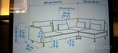 Divano 4 posti con chaise lounge chiusa (nel lato sinistro) modello Soderhamn Ikea. Cuscini sfoderabili 5 grandi e 4 piccoli.