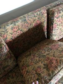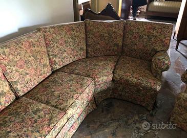 Divano 5 posti ad angolo retto + 2 poltrone con rivestimento in tessuto trama floreale come da foto; struttura di base in legno. Dimensioni di ingombro del divano 275x160cm circa, profondità 80cm e altezza 90; poltrone ingombro standard. Condizioni generali buone, imbottiture delle sedute in buone condizioni, nessuno strappo nel tessuto. Smontaggio e trasporto a carico dell'acquirente ma all'occorrenza posso fornire mezzo e personale a modica cifra da concordare. Scrivetemi solo se realmente intenzionati. Stra / Vigonza - Venezia / Padova. Prezzo 150 euro per tutto.