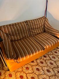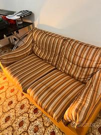 Struttura solida e comoda, cuscini ampi e schienali alti. Tessuto a righe sui toni del beige/marrone e base color ocra.