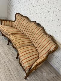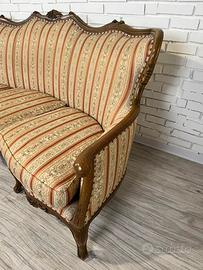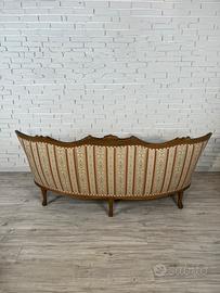 Divano a 3 posti di metà ’900 in legno massello intagliato a mano, con schienale sagomato di ispirazione classica francese e rivestimento originale a righe beige e rosso; struttura solida, ottime condizioni generali.