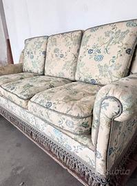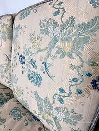 Divano a 3 posti e due poltrone coordinate in tessuto jacquard floreale dai toni delicati dell’azzurro e del verde. Le linee classiche con braccioli arrotondati, profili cordonati e frange decorative alla base conferiscono un carattere elegante e senza tempo.