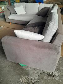 Divano grigio angolare in tessuto con 7 cuscini + due pouf cubici (uno bianco e uno rosso) con rivestimento grigio. Ottime condizioni, ma una parte del tessuto sotto il divano è rotta. Solo consegna a mano.