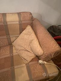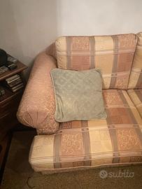 divano a due posti imbottito con un motivo a scacchi beige e rosa e braccioli arrotondati.