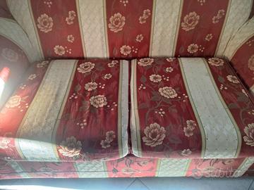 Vendo divano rosso a due posti, con fantasia. Usato in buone condizioni, sfilacciato solo sotto ai braccioli.