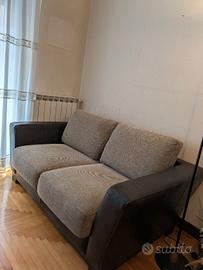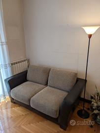 Divano a due posti di Divani&Divani con struttura rivestita in pelle testa di moro e sedute e schienali in tessuto simil velluto melange marrone e tortora.
