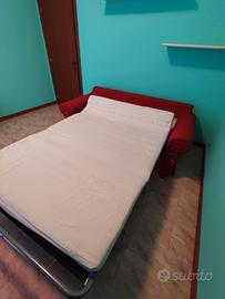 Divano a letto in tessuto, due posti, tenuto benissimo, rosso. Lungo 2 metri, altezza 90cm, profondità 90 cm. Seduta tra i due braccioli 1.5 mt. Avendo il furgone disponibile anche per il trasporto a casa previo rimborso economico.