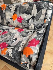 Divano a tre posti comodo, con rivestimento a motivo floreale moderno. Tessuto sui toni del grigio con fiori arancioni e rosa, dal look vivace e contemporaneo. Dotato di ampie sedute, schienale confortevole e base solida, ideale per il relax e l’uso quotidiano.