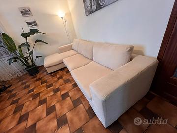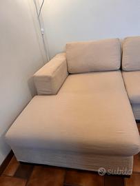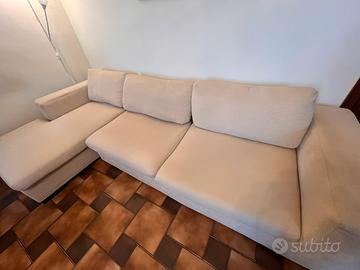Divano angolare 3 posti con chaise longue usato, interamente in tessuto sfoderabile color crema, cuscini schienale in piuma d’oca, struttura e piedini in legno.