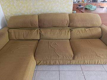 regalo divano ad angolo. profondità 2 m, larghezza 2,90, con 3 poggiatesta reclinabili, di colore verde. il rivestimento di un cuscino è leggermente rovinato in un angolo.