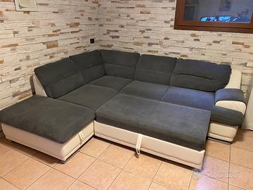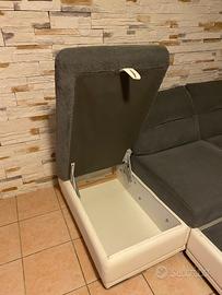 Divano letto angolare. Si trasforma in un letto matrimoniale tirando il cassetto riposto sotto le sedute. É dotato di un contenitore per riporre anche coperte e trapunte .Misure 260 x 220cm.