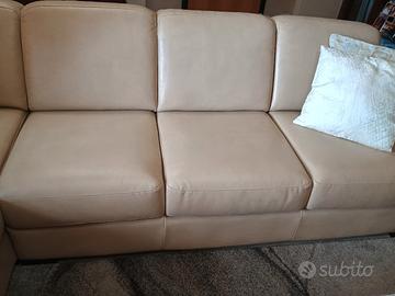 Vendo per cambio arredo un bellissimo divano angolare con penisola, colore beige. Il design è moderno e lineare ma adatto a qualunque stile sia moderno che più contemporaneo, perfetto per dare luminosità al salotto. In ottime condizioni, usato pochissimo. Il tessuto è pulito, senza strappi, macchie o segni di usura. Struttura robusta, stabile e nella seduta i cuscini sono sostenuti e confortevoli, permettono di mantenere perfettamente la forma. Misure: Larghezza totale: 151 cm + penisola: 60 cm posizionata a sinistra se guardata frontalmente. Lunghezza totale: 193,5 cm.