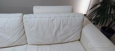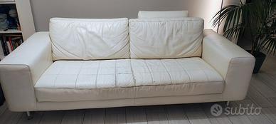 Divano Adile con tre sedute, in pelle di prima qualità, colore bianco latte, 220x90 ingombro totale, seduta 170x55, con piedini in plexiglass trasparente e alluminio. Struttura integra, segni di usura della pelle su seduta centrale come da foto, ma trattabile con intervento tappezziere o prodotti specifici. Ritiro piano terra .