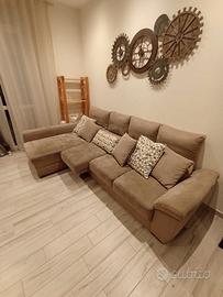 Divano tre posti con sedute estraibili + 22 cm (vedi foto)+ chaise longue con cassone contenitore (vedi foto). Profondità chaise longue 1,55 m. Larghezza divano 2,90 m. Profondità seduta 90 cm. Non sfoderabile. Colore grigio tortora.