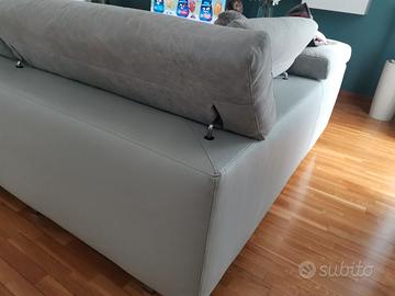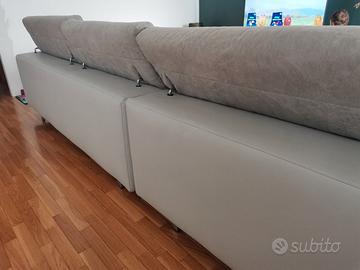 Vendesi divano angolare usato con penisola. La penisola è nella parte destra del divano. La struttura è in pelle color grigio ghiaccio mentre sedute, poggiatesta e cuscini sono in microfibra color grigio chiaro. Il divano è lungo 3 metri e largo 1.85 metri nella parte della penisola. Ritiro a carico dell' acquirente. Il divano è stato acquistato nel 2018 ed è in buone condizioni. Le sedute sono sfoderabili.