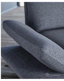 Il design è elegante e raffinato, grazie ai piedini acciaio inclinati e i braccioli mobili. Lo schienale può retrocedere e offrire una seduta più ampia, perfetta per serate “Cinema in famiglia”
