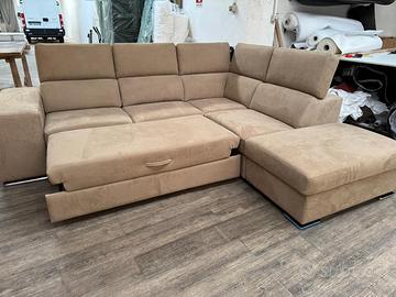 Eleganza, comfort e funzionalità si incontrano in questo splendido divano angolare letto, dalle dimensioni di 2,90 x 2,30 metri. Rivestito in tessuto effetto microfibra scamosciata, è proposto in una tonalità calda e neutra, perfetta per ambienti moderni e accoglienti.