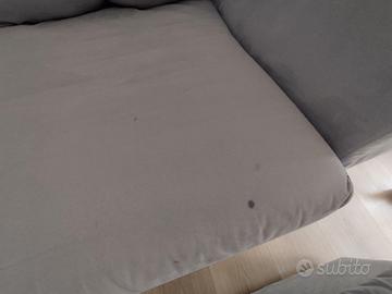 Vendo divano tre posti con chaise longue sfoderabile, in ordine e molto ben tenuto. Fodera color azzurro pastello, in tessuto. È macchiata in un paio di punti, come da foto. Molto comodo, seduta ampia ma poco ingombrante. Completo di poggiapiedi in perfetto stato, uguale al divano, anch'esso sfoderabile e lavabile in lavatrice. 350 euro trattabili.